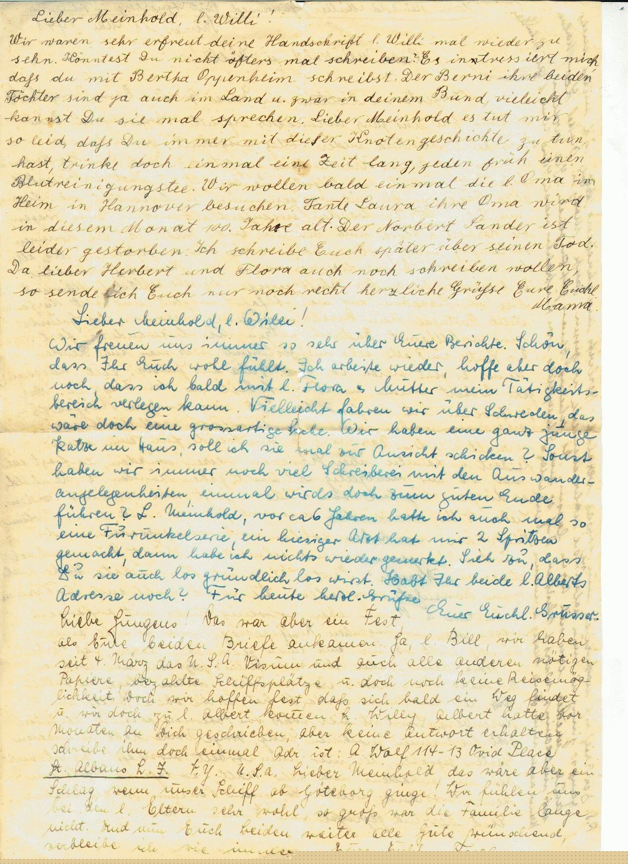 Wir waren sehr erfreut deine Handschrift l. Willi mal wieder zu sehen. Könntest Du nicht öfters mal schreiben? Es interessiert mich daß du mit Bertha Oppenheim schreibst. Der Berni u. ihre beiden Töchter sind ja auch im Land u. zwar in deinem Bund vielleicht kannst Du sie mal sprechen. Lieber Meinhold, es tut mir so leid, daß Du immer mit dieser Knotengeschichte zu tun hast, trinke doch einmal eine Zeit lang, jeden Morgen früh einen Blutreinigungstee. Wir wollen bald einmal die l. Oma im Heim in Hannover besuchen. Tante Laura [Müller, die Frau von Sebald Müller] ihre Oma wird in diesem Monat 100 Jahre alt. Der Norbert Sander ist leider gestorben. Ich schreibe Euch später über seinen Tod. Da lieber Herbert und Flora auch noch schreiben wollen, so sende ich Euch nur noch recht herzliche Grüße, Eure Euchliebende Mama.