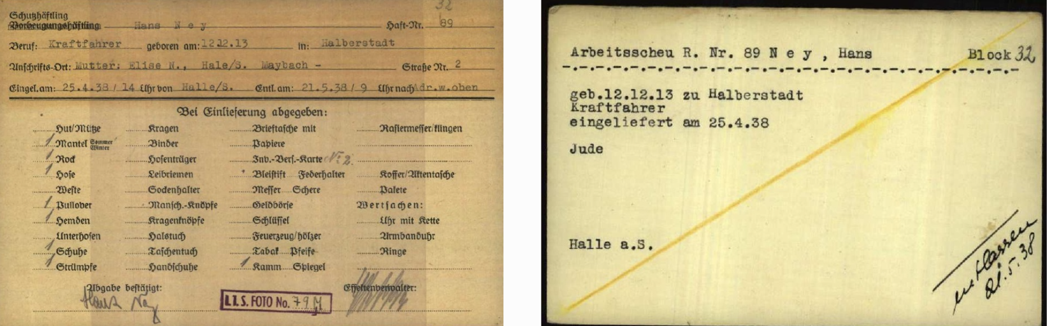 Im April 1938 wurde der 24-jährige Hans Ney im Zuge der Aktion „Arbeitsscheu Reich“ von der Kriminalpolizei in Halle verhaftet.