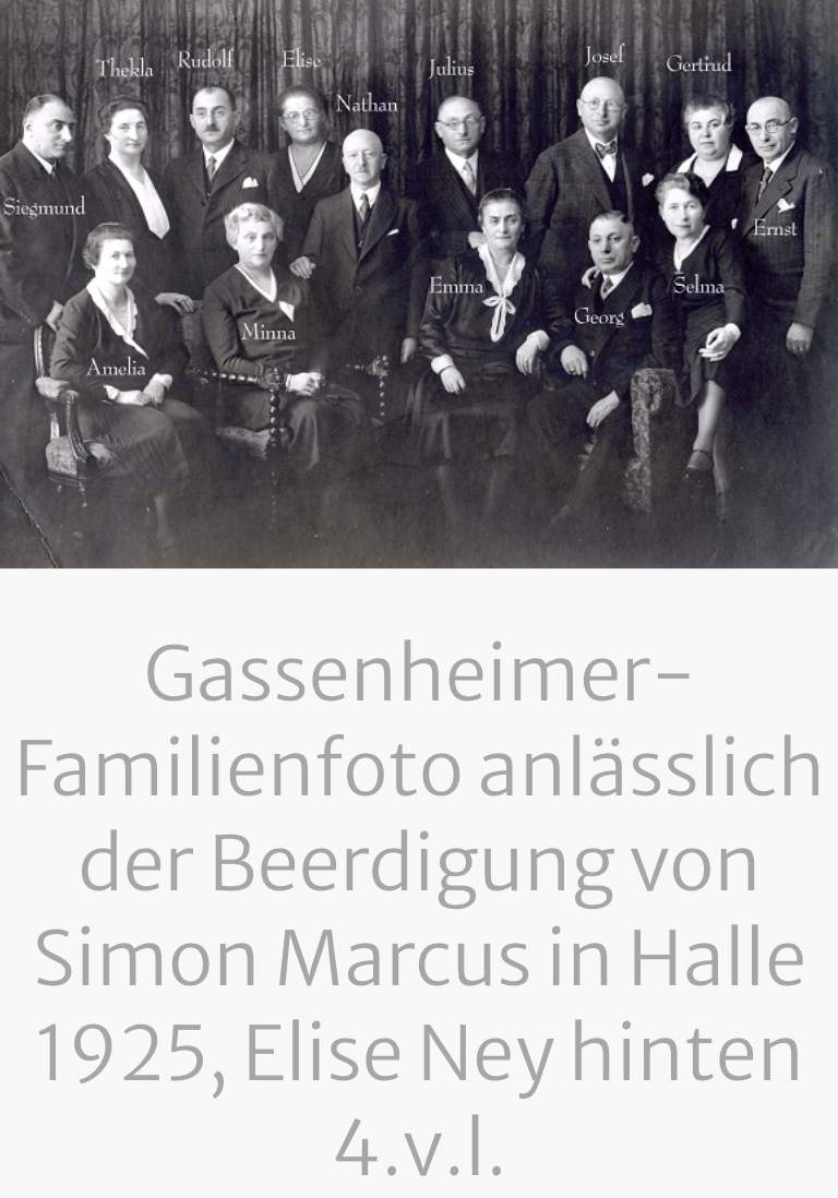 1913 heiratete Elise Gassenheimer den ebenfalls jüdischen Lederhändler Max Mosche Ney (* 18.2.1863 in Halberstadt) und zog zu ihm nach Halberstadt. Hier kam am 12. Dezember 1913 Sohn Hans zur Welt.