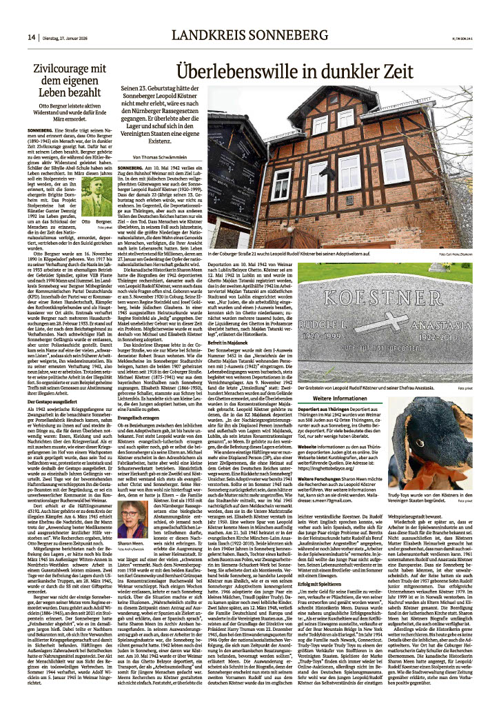 Am 10. Mai 1942 verlies ein Zug den Bahnhof Weimar mit dem Ziel Lublin. In den mit jüdischen Deutschen vollgepferchten Güterwagen war auch der Sonneberger Leopold Rudolf Köstner (1920-1999). Dass der damals 22-Jährige seinen 23. Geburtstag noch erleben würde, war nicht zu erahnen. Im Gegenteil, die Deportationszüge aus Thüringen, aber auch aus anderen Teilen des Deutschen Reiches hatten nur ein Ziel – den Tod. Dass Menschen wie Köstner überlebten, in seinem Fall auch Jahrzehnte, war wohl die größte Niederlage der Nationalsozialisten, die dem Wahn eines Genozids an Menschen, verfolgten, die ihrer Ansicht nach kein Lebensrecht hatten. Sein Leben steht stellvertretend für Millionen, deren am 27. Januar am Gedenktag der Opfer der nationalsozialistischen Herrschaft gedacht wird.