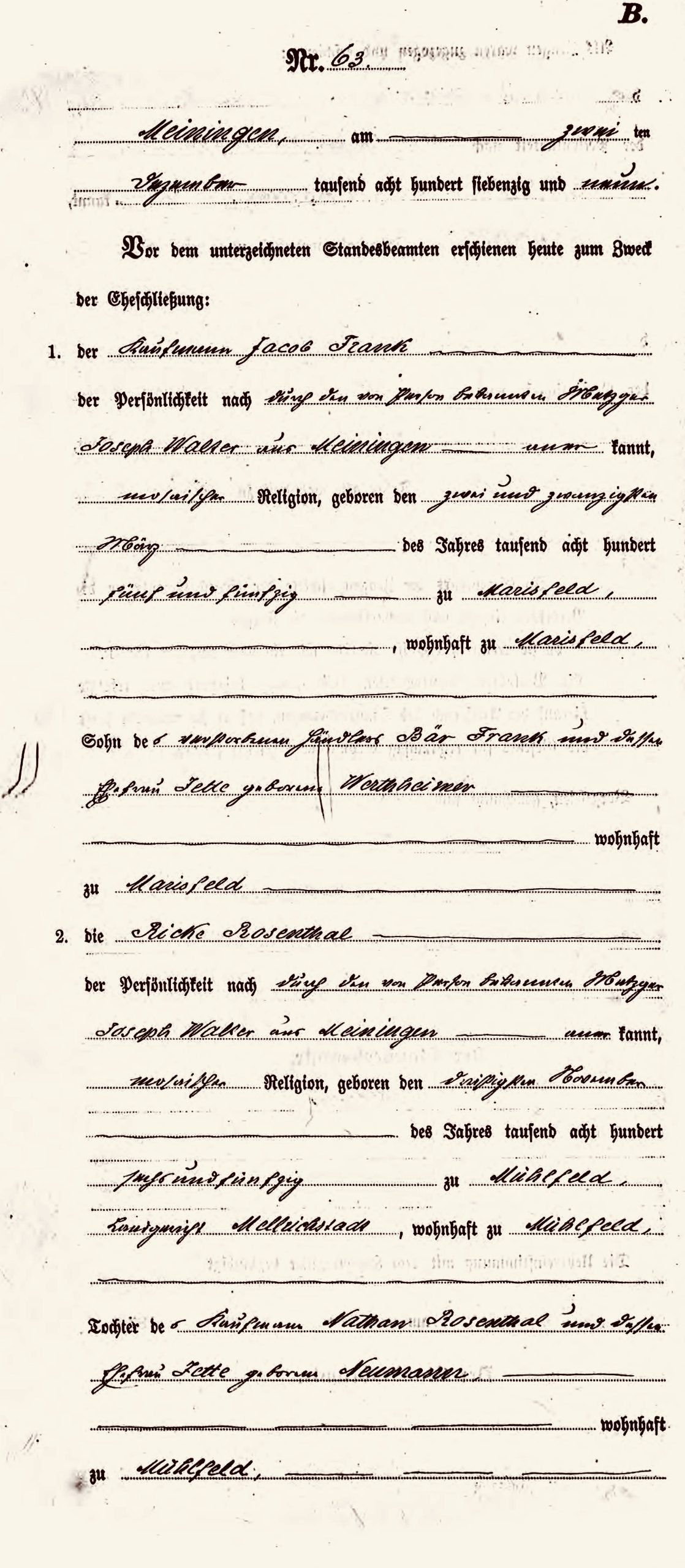 In 1866, Bär Jacob Frank died. Eleven years old at the time of his father’s death, Jacob grew up in Marisfeld with his mother. In December 1879, he married Fredericka. The couple lived in Marisfeld and had four children: Bernhard, Olga, Ilma/Alma, and Rose.