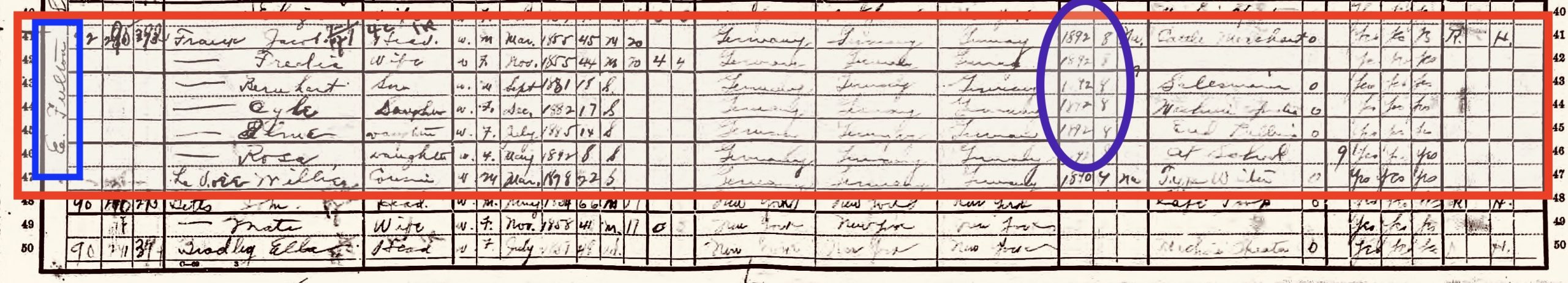 Whether or not Jacob accompanied his family or had travelled ahead the year before is still a puzzle: the ship’s manifest includes only the names of Ricka and the four children. Yet the designation of Ricka as “wife” raises the question “of whom”? Normally the answer would lie in the entry above her name, or possibly in the column of the person she was joining. But in this case, the entry above her name, which ought to be Jacob’s, is of another man. Is it possible that the immigration officials forgot to include an entry for Jacob? Another possible source of this data could be the federal censuses, but in this case they too confuse. Through the early 1900s, when the census recorded the date of immigration as provided by the individual, the answer Jacob provided varied between 1891 and 1892. We may never know!