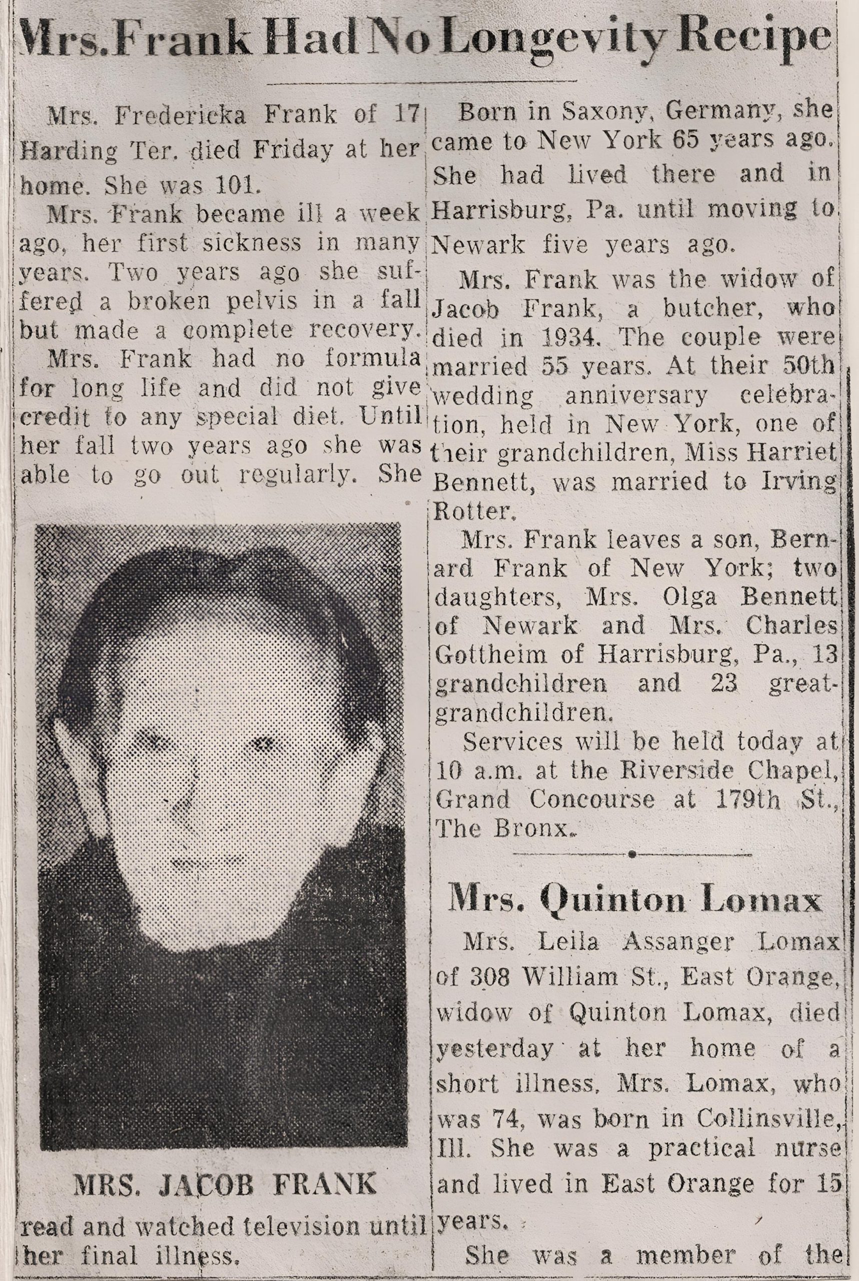In 1929, Jacob and Fredericka Frank celebrated their 50th wedding anniversary. Five years later, on 26 November 1934, Jacob died, 79 years old. He was buried in Mount Carmel cemetery in Glendale/NY. Sometime after Jacob’s death, Frederika moved to Harrisburg, Pennsylvania, where her daughter Rose was living with her family. The 1940 census records her living with daughter Ilma in the Bronx and in 1950 she was living with Rose’s family. Then, in 1953 she moved to Newark where her, daughter Olga lived. She died at home on 24 January 1958 after a brief illness. She was 101 years old!